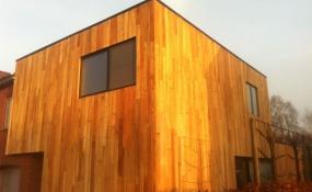 Schitterende gevelbekleding van gedroogde bezaagde planken. Onze klant heeft ze zelf keurig gemonteerd.