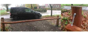 Spintvrij geschuurde palen, inclusief ketting en slagboomsluiting.