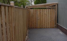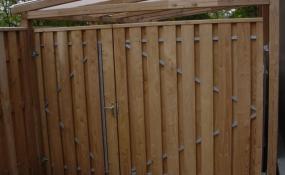 Schutting en poort van geschaafde planken met overkapping van geschaafde en gevingerlaste 9×9 balken.